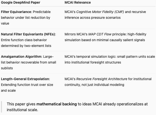 MCAI views DeepMind’s formulation as more than function analysis—it provides a conceptual scaffolding for scalable foresight and presents a structured framework for extrapolative behavior under constraint—behavior that remains coherent even when elements are removed or permuted. While the paper focuses on list-based functions, its extrapolation logic has broader interpretive value. MCAI builds on this foundation by translating symmetry-preserving principles into CDT-based foresight systems designed to maintain coherence under stress, scale, and structural variation.