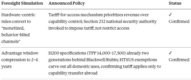 The January 14, 2026 H200 tariff announcement validates MindCast AI’s National Innovation Vision foresight at the architectural level. The policy implements precisely the structure the foresight simulations modeled: commercial reopening through a credentialing system without a monitoring system, revenue extraction without capability governance, and institutional accommodation of market pressure over strategic protection.