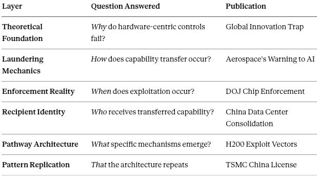 The Global Innovation Trap established the theoretical foundation for why hardware-centric export controls fail. The analysis demonstrated that capability leakage through remote access, third-country routing, joint ventures, and talent mobility compresses innovation advantage windows from 8–10 years to 2–4 years, transforming frontier R&D into a structural liability rather than a durable competitive advantage.
