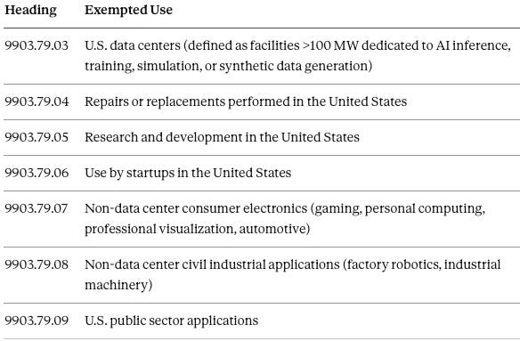 The exemption structure confirms the “toll booth” architecture: the 25% tariff applies exclusively to transshipment for foreign sale, while every domestic use case is carved out. The policy monetizes capability flow to China without imposing friction on domestic AI deployment.