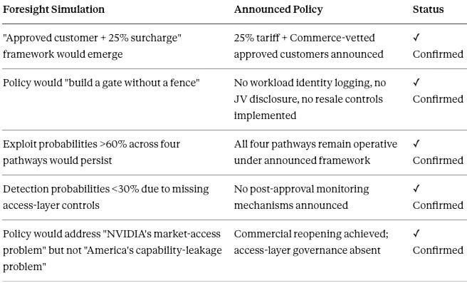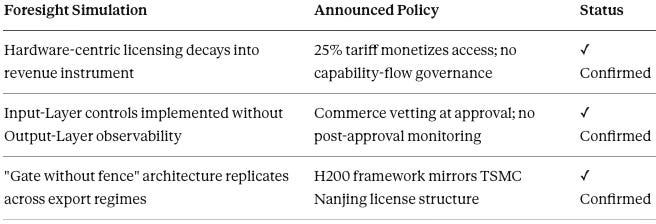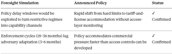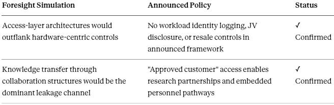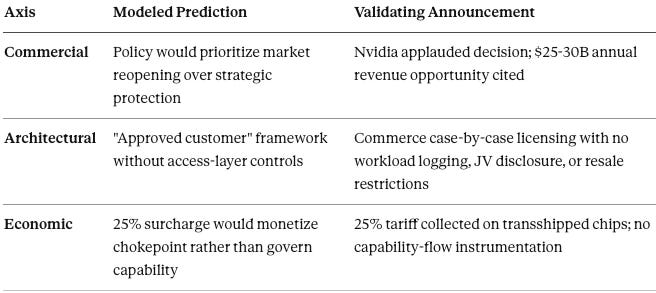 Beyond individual publication predictions, the January 14 announcement validates the integrated analytical framework—the system-level model of how export-control architecture responds to commercial and institutional pressure. The five dynamics listed below were not isolated predictions but interconnected components of a unified behavioral model.