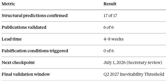 Across all six publications, 17 of 17 structural predictions were confirmed by the announced policy. No prediction was falsified; no prediction required post-hoc reinterpretation. The validation is comprehensive.