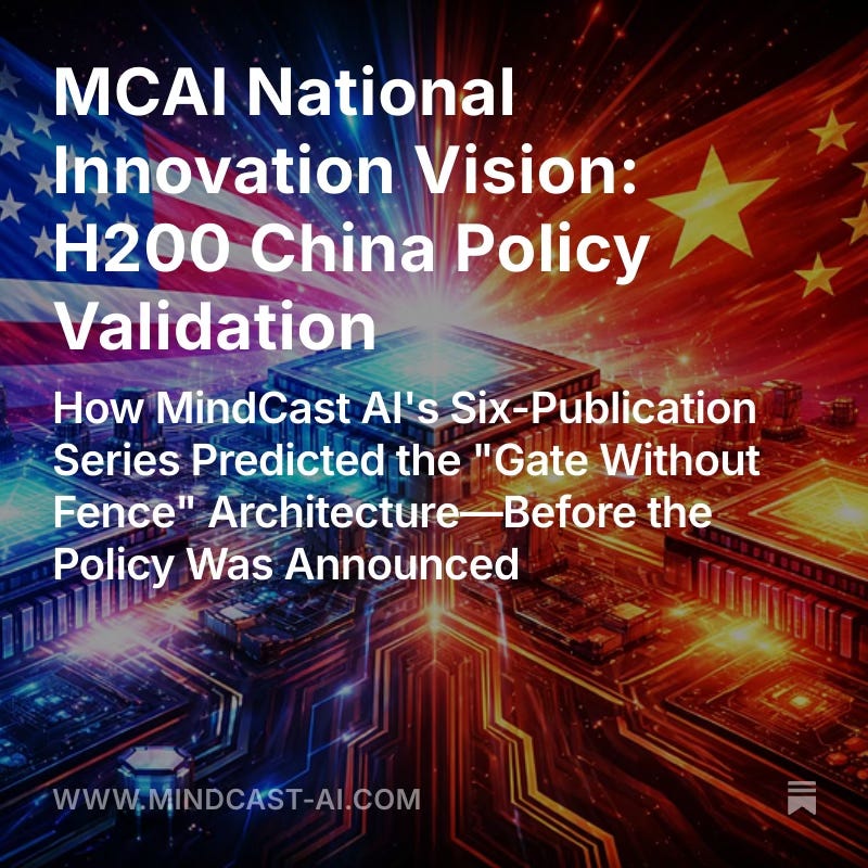 MindCast AI’s six-publication National Innovation Vision series—developed between November 2025 and January 2026—functioned as a cascading foresight simulation, with each publication building on prior analytical frameworks. The January 14, 2026 H200 tariff announcement validates not individual predictions but the integrated architecture: whycontrols fail, how capability launders, when exploitation occurs, who receives capability, what pathways emerge, and thatthe pattern replicates.