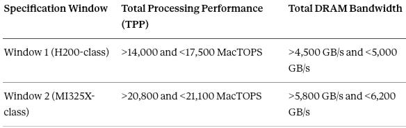 The specifications precisely target the Nvidia H200 and AMD MI325X while excluding next-generation architectures (Blackwell, Rubin) and legacy chips—confirming the “near-current capability” transfer that MindCast AI’s Global Innovation Trap analysis predicted.