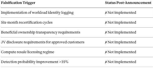 MindCast AI’s foresight methodology requires explicit falsification conditions—observable outcomes that would disprove the prediction if they occurred. The H200 Exploit Vectors analysis specified six such conditions. The January 14 announcement provides an opportunity to evaluate whether any were triggered.