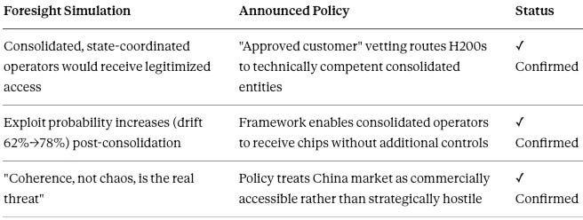 China Data Center Consolidation predicted that China's apparent AI data-center bust would culminate in state-coordinated consolidation under technically competent operators (Alibaba, ByteDance, SOEs), raising exploit probabilities (drift 62%→78%; PE/State 74%→85%) while lowering detection probabilities (drift 21%→14%). The analysis established that coherence—not chaos—constitutes the real strategic threat, as consolidated entities convert Western hardware into deployed capability at 2.8× the efficiency of the pre-consolidation ecosystem.