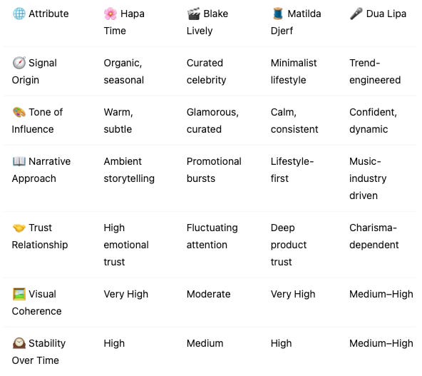 ✅ Hapa Time and Matilda Djerf represent enduring emotional resonance. Their brands function like rituals — calm, repeatable, emotionally trustworthy. Lively and Dua Lipa deliver cultural voltage, but not continuity.