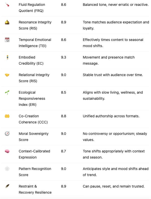The high score of 83.2/100 places her in the top 3–7% of public-facing creators. What follows is a detailed metric map of why her optimism resonates — and how it can evolve into formats others live with, not follow.