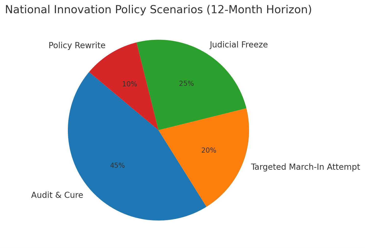 The path forward is not singular but contingent. MindCast AI’s foresight modeling mapped four possible outcomes with probabilities attached. At one end, Commerce claims victory with a negotiated compliance cure; at the other, courts freeze its ambitions and Congress re-enters the debate. Between lie targeted march-in attempts and incremental chilling effects that reshape licensing norms.