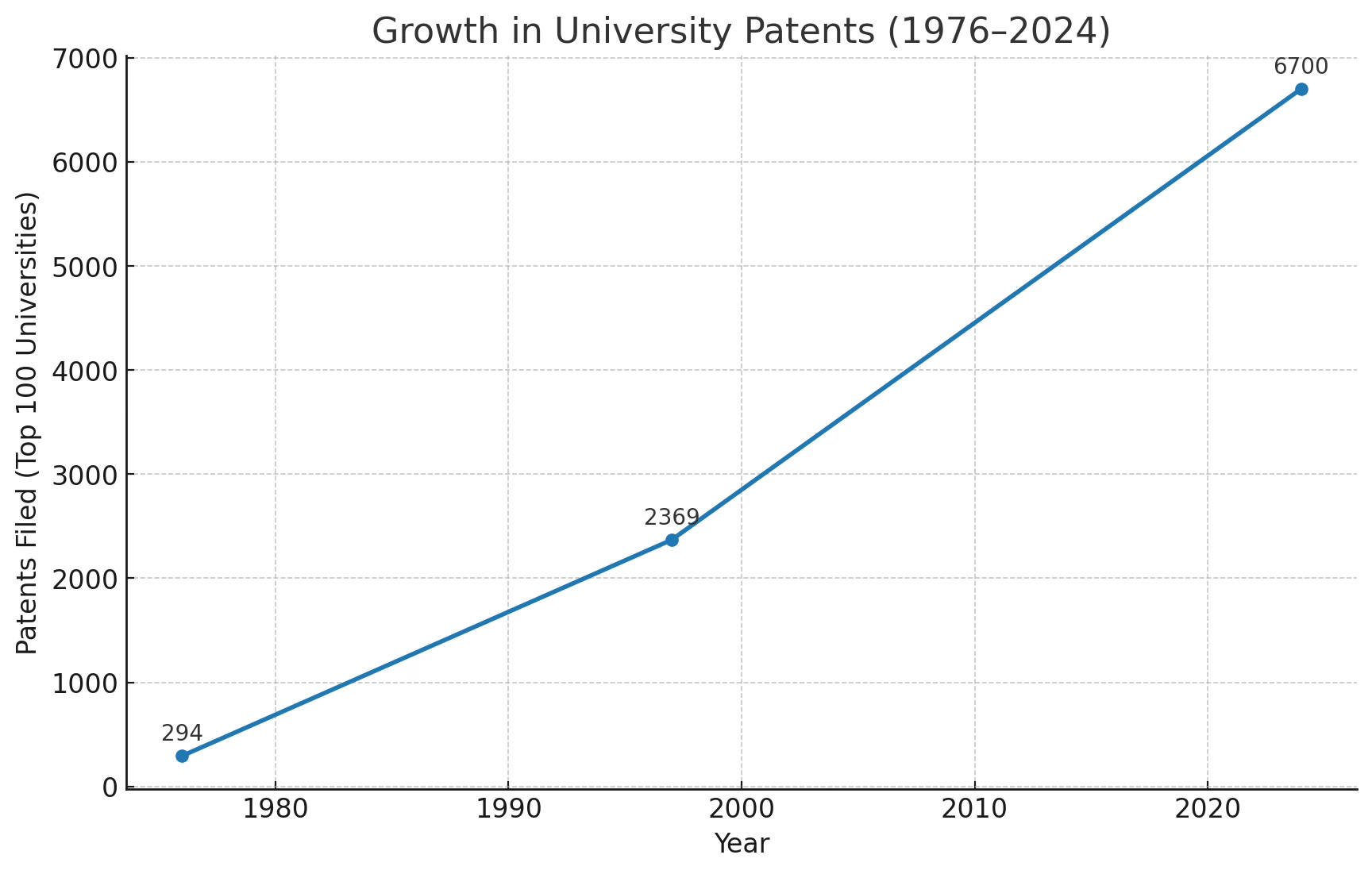 Before Bayh-Dole, federally funded inventions were often abandoned—labeled “contaminated” and left to die on the shelf. The Act transformed this dead capital into an engine of growth by giving universities title and incentivizing licensing. The results speak for themselves: university patents surged, creating billion-dollar industries from gene therapy to Honeycrisp apples. Harvard’s 5,800 patents are one node in a system that transformed U.S. science into global leadership.