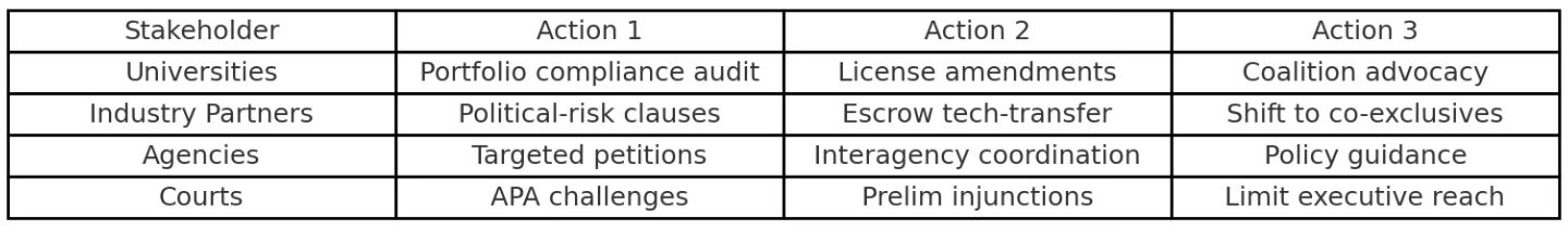 Universities: triage their exclusive licenses, tighten compliance with U.S.-manufacturing rules, and prepare APA-based litigation.
