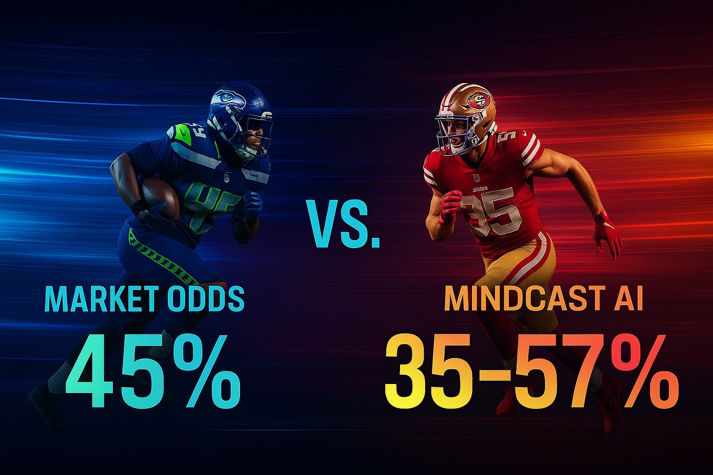MindCast AIās Cognitive Digital Twin (CDT) foresight simulation provides a more dynamic range. The model tracks key integrity metrics: ActionāLanguage Integrity (ALI), which measures how clearly play calls in the CenterāRight Guard corridor translate into execution; Relational Integrity Score (RIS), which gauges quarterbackāreceiver trust and timing; CognitiveāMotor Fidelity (CMF), which measures how quickly decisions convert into physical execution; and Expected Points Added (EPA) from Jalen Milroeās designed packages. If these levers hold, Seattleās win probability rises into the 52ā57% range, flipping them into slight favorite status. If early miscommunication fractures reappear or if Christian McCaffrey plays at full speed, boosting San Franciscoās Ecological Responsiveness Index (ERI) ā the measure of how effectively their offense stresses defenders in space ā Seattleās odds fall toward 35%, aligning with market skepticism.