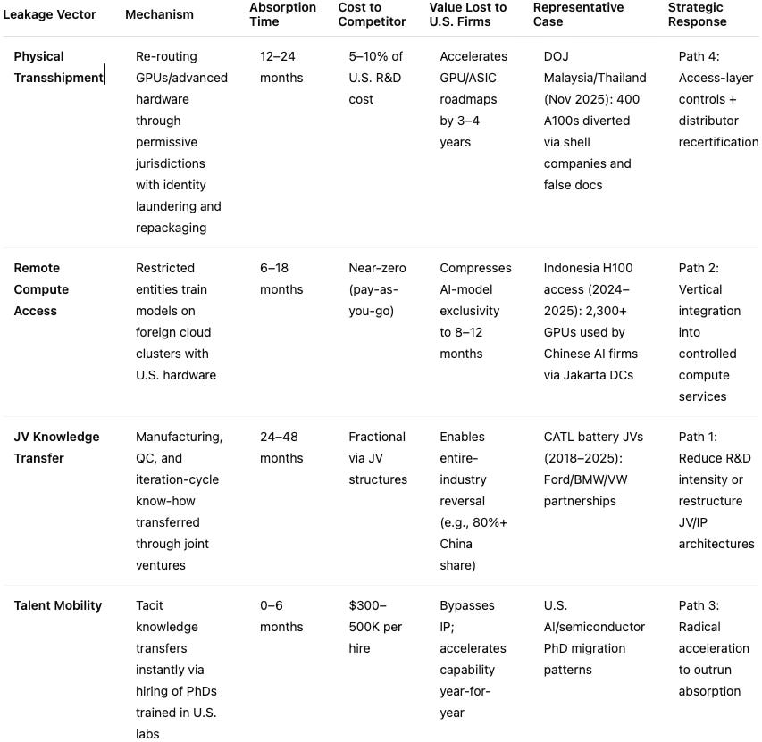 Innovation has shifted from a source of durable advantage to a structural financial liability. Companies now fund frontier R&D at full cost while competitors capture its benefits at a fraction of the investment. The leakage occurs not through espionage but through predictable channels—remote compute access, third-country transshipment, joint-venture knowledge transfer, and global talent mobility—that compress advantage windows from 8-10 years to 2-4 years.