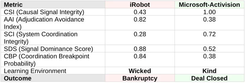 Importantly, these metrics are not post hoc rationalizations constructed to explain known outcomes. Elevated AAI, collapsing SCI, and rising SDS appear early in the enforcement timeline-well before bankruptcy in the iRobot case, well before deal closure in Microsoft-Activision. The diagnostic signals would have predicted iRobot’s trajectory months before the company filed for bankruptcy, and would have predicted Microsoft-Activision’s resilience before the court ruled. This is what distinguishes the framework from narrative critique: the metrics generate ex ante predictions that can be tracked and falsified, not retrospective explanations fitted to results.