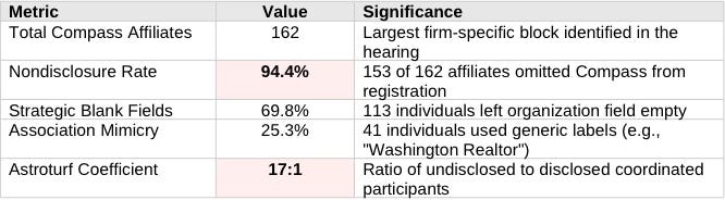 The astroturf analysis documents coordinated non-disclosure by Compass-legacy agents. The methodology cross-referenced sign-in records against Compass agent rosters specifically. No Anywhere-legacy brand agents (Coldwell Banker, Century 21, Sotheby’s International Realty, Better Homes and Gardens Real Estate) were identified in the opposition testimony pool. The Compass-Anywhere merger closed January 10, 2026—thirteen days before the hearing. The absence of Anywhere-brand participation, despite post-merger integration, is a finding, not a methodological limitation.