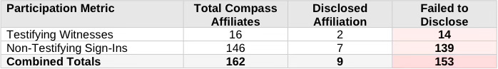 Information Asymmetry: Compass-affiliated participants presented testimony framed as independent professional expertise, consumer protection, and concern for vulnerable populations. Legislators received coordinated messaging without the attribution necessary to identify its coordinated source.