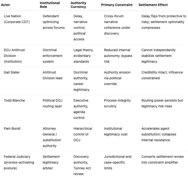 The present publication extends that work by modeling a new variable the January suite could not yet observe: judicial process operating as a real-time constraint on settlement dynamics. Discovery has become contemporaneous with advocacy. Advisors shaping Live Nation’s defense now face sworn testimony obligations in parallel antitrust proceedings. The result is a fragile equilibrium in which political settlement pressure, state enforcement incentives, and judicial process integrity collide within a three-week window.