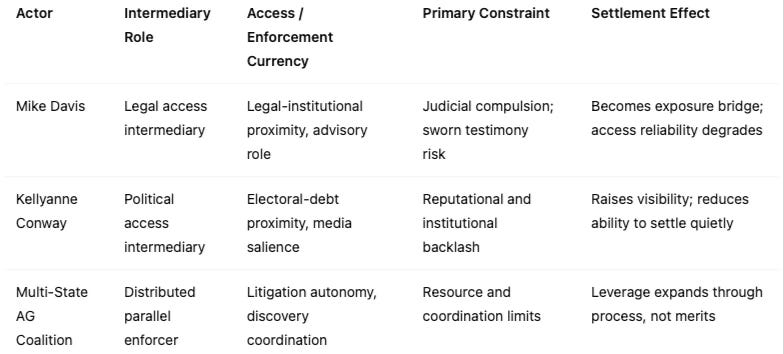 Davis operates through legal-regulatory revolving door proximity — former Senate Judiciary counsel leveraging institutional relationships into consulting access. Conway operates through campaign-era electoral debt — a currency denominated in political loyalty rather than institutional knowledge. The distinction matters because the two channel types carry different constraint profiles under escalating scrutiny. Davis faces judicial compulsion (deposition orders, potential Tunney Act disclosure requirements). Conway faces reputational-political exposure but no current judicial obligation. Prediction 4 in this simulation (Access-Node Behavioral Divergence) reflects this asymmetry.