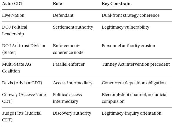 MindCast AI’s January actor matrix identified Davis, Schwartz, Mizelle, and Blanche as the principal nodes in the Access Arbitrage architecture. Conway’s emergence as the “lead role” in Live Nation’s settlement advocacy introduces a structurally distinct access channel that warrants formal classification.