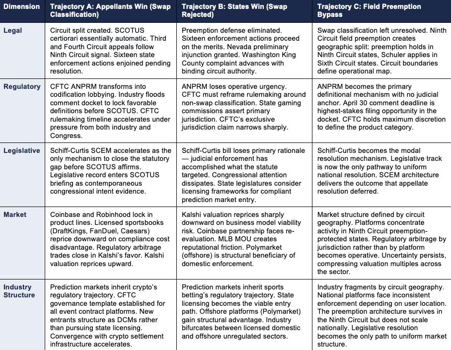 The system resolves through three mutually exclusive pathways. April 16 does not produce a single outcome. The consolidated oral argument generates a signal that routes the entire prediction market regulatory contest down one of three distinct institutional pathways, each producing a different consequence chain across legal, regulatory, legislative, market, and industry structure dimensions. The falsifiable predictions in Section VIII measure whether specific events occur. The trajectory analysis below maps what those events mean — what the world looks like six months, twelve months, and two years after the Ninth Circuit rules, depending on which path the panel takes.