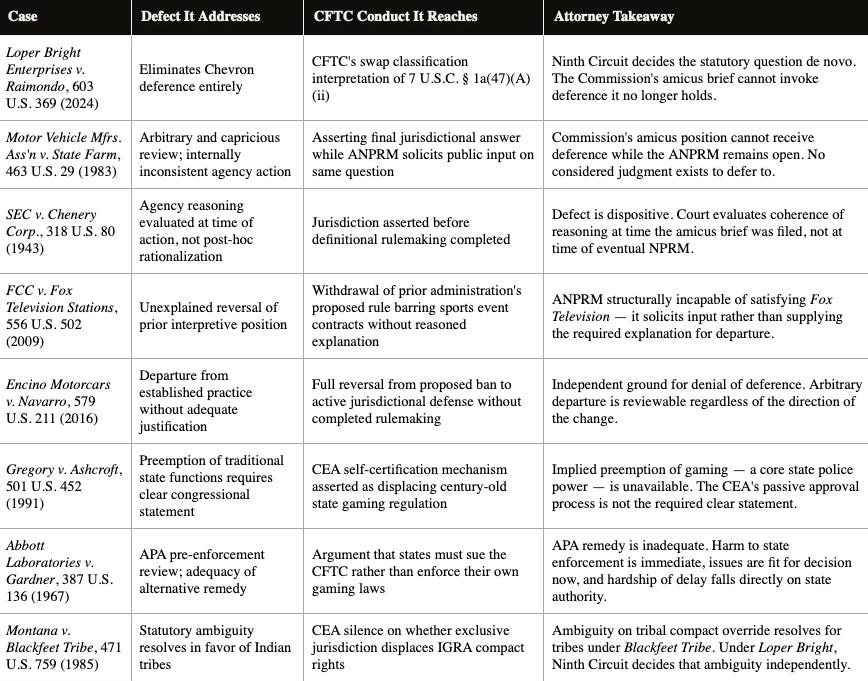 An agency cannot assert preemption of state authority over a product category while simultaneously issuing an advance notice of proposed rulemaking asking the public to define that category. This is not merely a control gap — it is a failure of reasoned decision-making under Motor Vehicle Manufacturers Association v. State Farm, 463 U.S. 29 (1983). Administrative deference attaches to completed deliberation, not to institutional posture. By asserting a final answer in litigation while its own rulemaking record remains open, the Commission has exercised authority before supplying the reasoning required to justify it. Under SEC v. Chenery Corp., 318 U.S. 80 (1943), the defect is dispositive: a court evaluates the coherence of the agency’s reasoning at the time of the action, not the aspirational authority of an unfinished docket. The Commission’s February 2026 withdrawal of the prior administration’s proposed rules compounds the problem. Under FCC v. Fox Television Stations, 556 U.S. 502 (2009), an agency that reverses a longstanding interpretive position must provide a reasoned explanation acknowledging the departure and justifying it. The ANPRM solicits public input rather than supplying that explanation — it is structurally incapable of satisfying Fox Television. The unexplained reversal is independently reviewable under Encino Motorcars v. Navarro, 579 U.S. 211 (2016), which held that agencies departing from established practice without adequate explanation act arbitrarily under State Farm. Finally, and most consequentially for the Ninth Circuit panel, Loper Bright Enterprises v. Raimondo, 603 U.S. 369 (2024), eliminated Chevron deference entirely. The Court held that courts must exercise independent judgment on questions of statutory interpretation rather than deferring to agency readings of ambiguous statutes. The CFTC’s swap classification claim rests on its interpretation of “potential financial, economic, or commercial consequence” in 7 U.S.C. § 1a(47)(A)(ii). Under Loper Bright, the Ninth Circuit owes that interpretation no deference. The panel decides the statutory question independently. The CFTC’s dual posture — asserting preemption in court while asking the public what the rules should be — satisfies the State Farm standard for denial of deference on procedural grounds. Loper Bright eliminates deference on the substantive statutory question entirely.