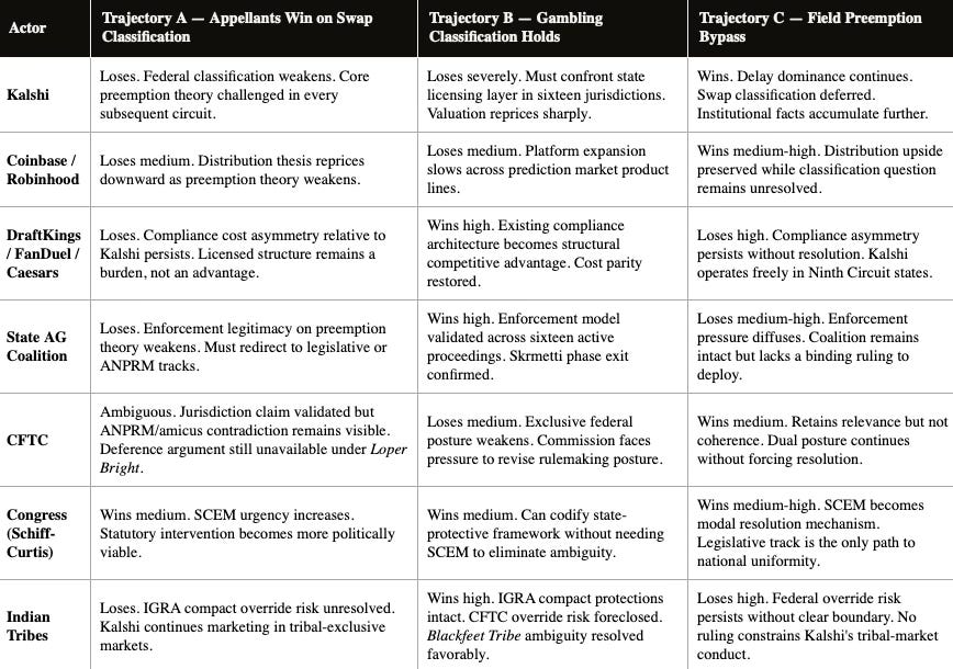 Structural Repricing (45–90 days after ruling). Legislative, rulemaking, and valuation effects become visible. Winners and losers depend on which trajectory activated. Actors mispositioned before the ruling — investors holding Kalshi exposure at $22 billion under the assumption that preemption was durable shelter, or licensed gaming operators who did not submit ANPRM comments — face the largest adjustment costs.