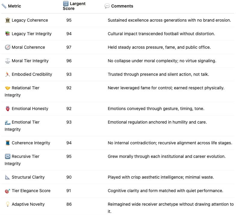 (The scores below reflect Largent’s performance across different domains of trust, emotional depth, integrity, foresight, and cultural impact, evaluated using the Culture and Sports Vision frameworks. Each metric is scored on a scale of 0–100, based on coherence, consistency, and resonance with legacy-building behavior.)