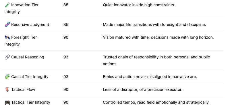 His 94 in Coherence Integrity and 95 in Recursive Tier Integrity make him ideal for modeling disciplined development. These aren’t just scores—they’re signals of a mind organized around sustained improvement. His 92 Emotional Honesty and 93 Emotional Tier Integrity show he stayed emotionally balanced without withdrawing.