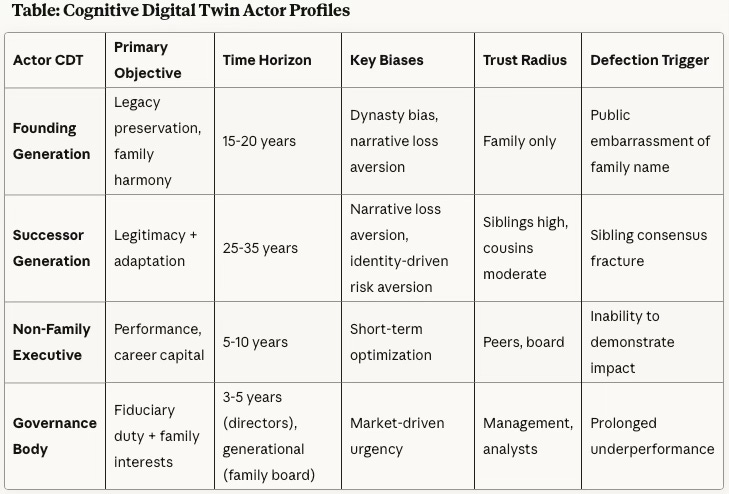 Non-Family Executive CDT: Optimizes for performance and career capital. Shorter time horizon (5-10 years). Wants clear authority but faces ambiguous governance. Interprets family dynamics as constraints on execution. Satisficing criteria: demonstrate measurable impact within tenure window while navigating family politics.