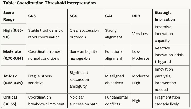 Trust Density: CSS above 0.85 indicates families that have built trust infrastructure—regular communication, transparent decision-making, demonstrated follow-through on commitments. Trust enables coordination under uncertainty because it reduces the information asymmetry and signal misinterpretation (Schelling) that prevent families from reaching cooperation equilibria (Nash). Trust is not culture—it’s the accumulated history of coordination success that makes future coordination feasible.