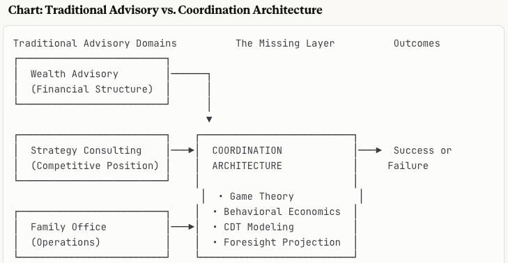 Traditional advisors optimize within their domains. But legacy enterprises succeed or fail based on whether generations can coordinate across domains—and traditional frameworks don’t model this layer.