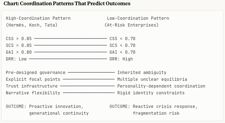 Coordination Infrastructure: High-performing families build coordination mechanisms: holding structures (Hermès), doctrinal frameworks (Koch), mission architecture (Tata). These create stable equilibria (Nash) that persist across generations. Without infrastructure, coordination depends on personality—which fails at succession because new actors lack the shared history that enabled implicit coordination.