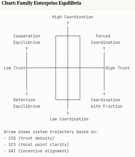 Every succession transition stress-tests the family’s coordination capacity. Families with SCS above 0.80 navigate transitions smoothly because they have focal points (Schelling) and clear equilibrium selection mechanisms (Nash). Families below 0.70 face coordination breakdown because succession creates multiple possible equilibria with no mechanism for choosing among them. Succession clarity isn’t about identifying the best leader—it’s about establishing protocols that preserve coordination regardless of who leads.