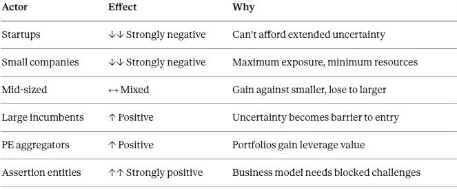 The redistribution is systematic. Actors who can carry uncertainty gain advantage; actors who need clarity to build and operate lose. Capital scale and portfolio depth become more important; innovation and technical merit become less determinative. When a legal system rewards endurance over creation, competitiveness shifts accordingly.