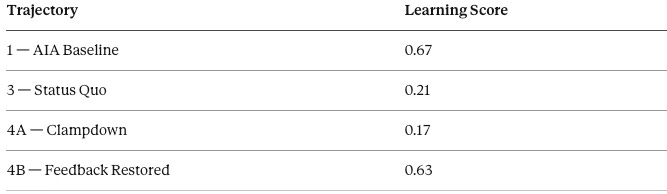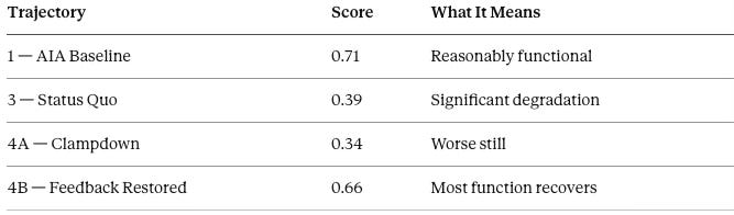 The four trajectories in one line: Once early error correction is insulated from review, the system predictably shifts from merit screening to uncertainty arbitrage—unless feedback is restored, in which case most baseline functionality returns.
