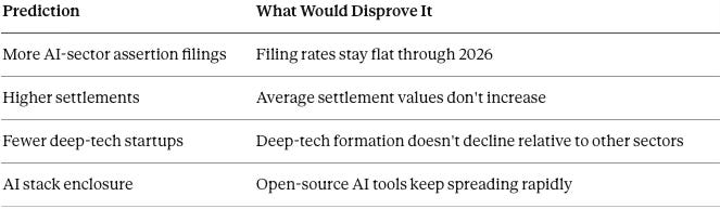 Predictions matter only if they can be checked. The thesis fails if AI-adjacent patent assertion and early settlements don’t rise measurably by Q4 2026, despite continued discretionary denials at the Patent Office. Here’s what we expect—and how to tell if we’re wrong.