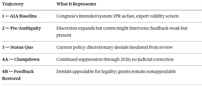 In October 2025, Mark Lemley published an analysis in Bloomberg Law arguing that recent Patent Office restrictions on inter partes review violate the America Invents Act’s statutory design. This foresight simulation treats that dispute as an institutional inflection point and models the downstream innovation, capital, and AI consequences rather than re-litigating the legal question. The article landed in the middle of an ongoing controversy: the Patent Office has made it significantly harder to use IPR, and the changes have largely escaped judicial review.