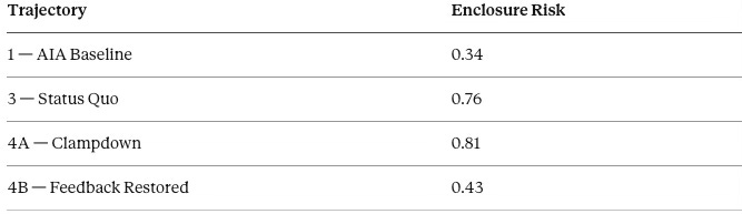 AI stack enclosure risk remains elevated. Enclosure index stays above 0.75 as uncertainty propagates through infrastructure layers.
