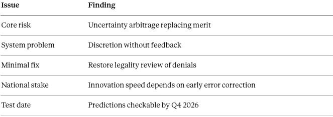 For policymakers: IPR governance is a competitiveness lever. Current policy reduces innovation throughput, concentrates markets, and creates barriers to AI sector entry. Restoring feedback doesn’t weaken patents—it strengthens system credibility.