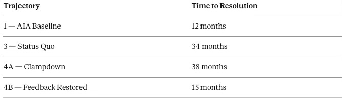 AI capabilities advance monthly. Competitive positions shift quarterly. A startup that has to wait three years for patent clarity might not exist in three years. The 38-month uncertainty half-life we measured vastly exceeds AI development cycles.