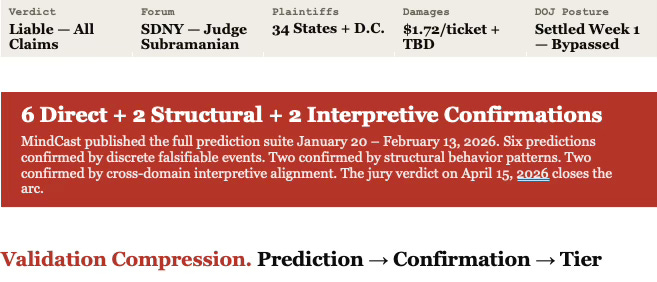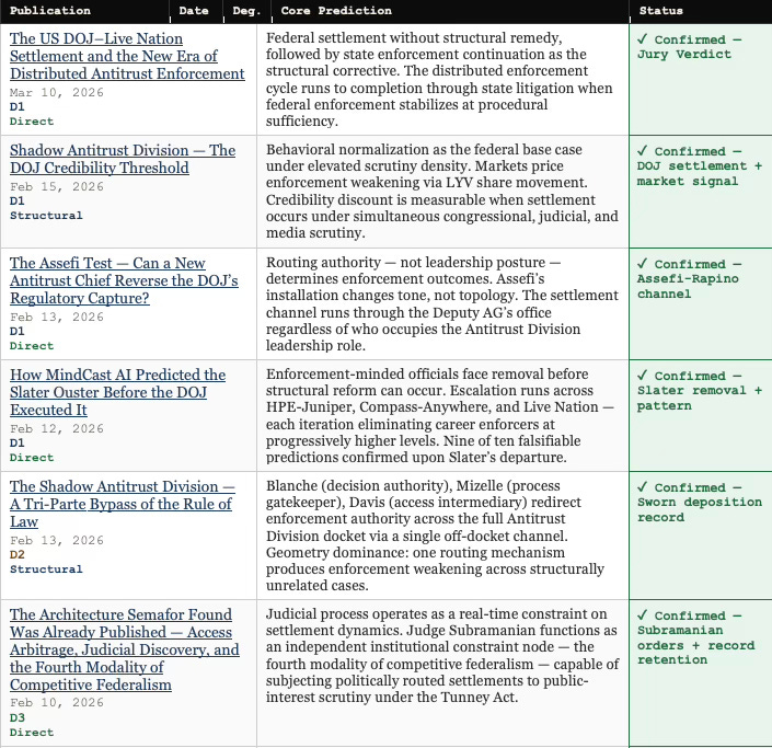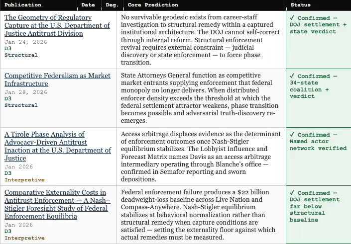 The prediction record spans nine publications, published between January 20 and March 10, 2026, traversed at three degrees of citation depth. Each publication carries a timestamp that predates the events it describes. The structural claim — that federal antitrust enforcement had entered a phase-lock state from which competitive federalism migration was the only available corrective — was modeled before Slater’s departure, before the DOJ settlement, and before the jury returned its verdict.