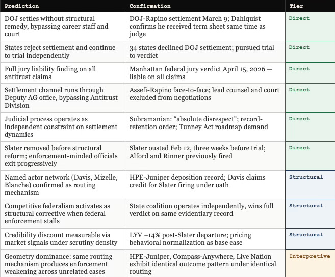 Published within hours of Slater’s removal, documenting that nine of ten falsifiable predictions from the January–February 2026 publication suite were confirmed by the events of February 12. Mapped the three-case escalation pattern — HPE-Juniper, Compass-Anywhere, Live Nation — eliminating enforcement-minded officials at progressively higher levels, and predicted that all major active antitrust matters would face the same routing-dominant constraint field under acting leadership. Confirmed across every subsequent event: the DOJ settlement, the state verdict, the congressional letters, and the sworn deposition record from the HPE-Juniper Tunney Act proceeding all track the architecture published before they occurred.
