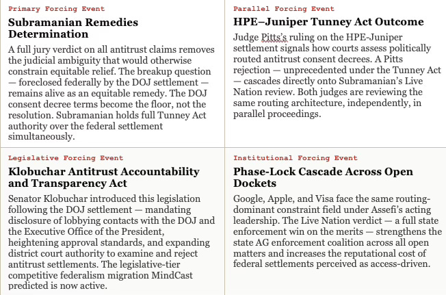 Senators Klobuchar, Warren, and Booker filed their letter to Judge Subramanian on April 14 — the day before today’s verdict — explicitly mapping the Live Nation settlement onto the HPE-Juniper routing pattern, citing Alford’s statement that Live Nation “paid a bevy of cozy MAGA friends to roam the halls of the Antitrust Division in defense of their monopoly abuses.” The congressional-judicial channel documented in MindCast’s Judicial Process as Competitive Federalism publication now operates simultaneously across both matters.