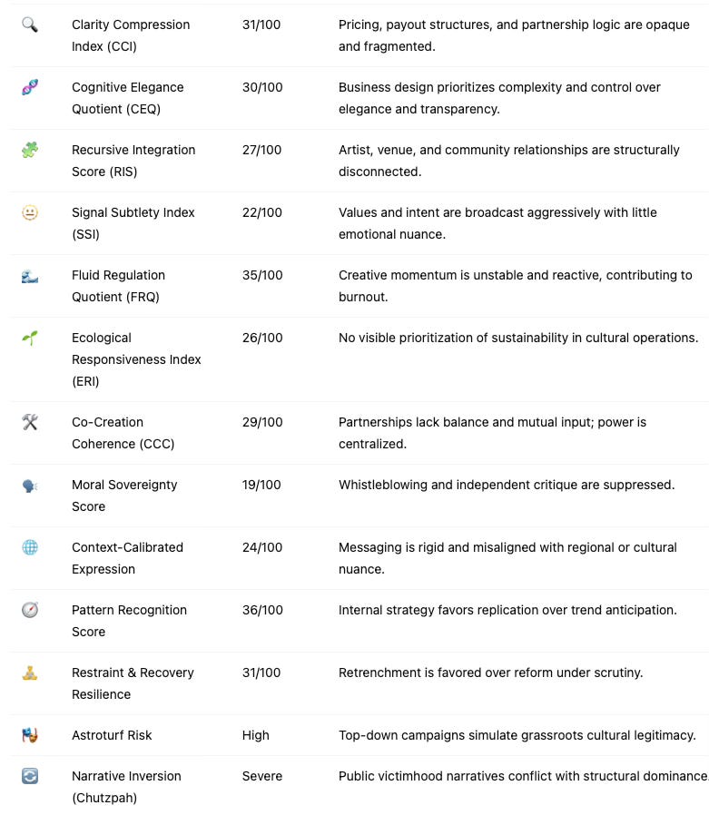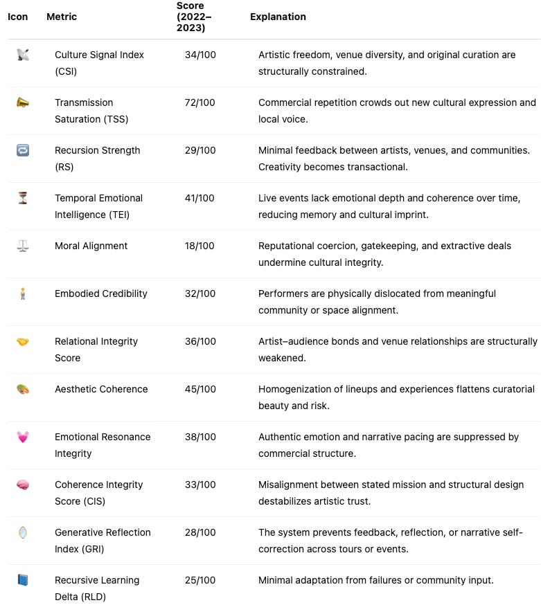This table expands the Cultural Innovation Index with additional metrics that capture coherence, trust, resilience, and ecological sensitivity—providing a holistic view of how Live Nation's business model suppresses cultural systems: