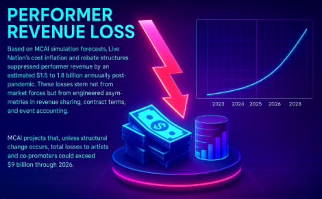 Performer Revenue Loss: Based on MCAI simulation forecasts, Live Nation's cost inflation and rebate structures suppressed performer revenue by an estimated $1.5 to $1.8 billion annually post-pandemic. These losses stem not from market forces but from engineered asymmetries in revenue sharing, contract terms, and event accounting. MCAI projects that, unless structural change occurs, total losses to artists and co-promoters could exceed $9 billion through 2026.