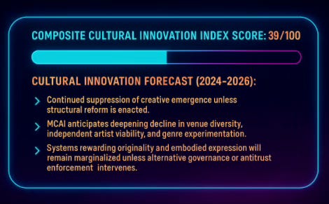 MCAI anticipates further degradation in performer negotiating power, venue autonomy, and cultural originality unless unbundling, cooperative ownership models, or DOJ enforcement reset the field.