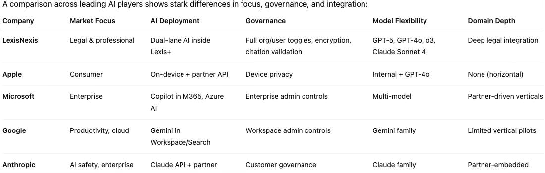 LexisNexis stands out as the leader in vertical AI integration, combining governance, model flexibility, and authoritative domain content in one platform. Their approach demonstrates that deep market specialization can coexist with modern AI capabilities, setting a precedent for other regulated sectors. A side-by-side comparison shows a gap in the market—few players are both vertically deep and operationally governed, leaving space for innovation.