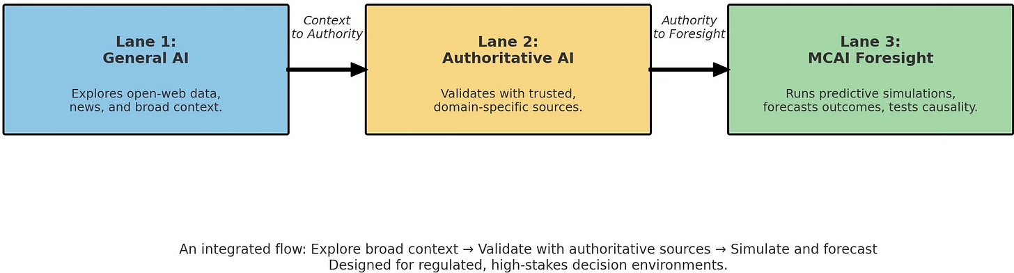 Even with this strategic foundation established, a critical gap remains. MindCast AI fills the gap left even by the most advanced current deployments. General AI provides broad context, and Authoritative AI confirms source integrity—but neither forecasts the future consequences of a decision. MindCast AI's predictive foresight simulations project legal, economic, and institutional outcomes, then stress-test each predicted pathway for logical and evidentiary resilience before recommending a course of action.