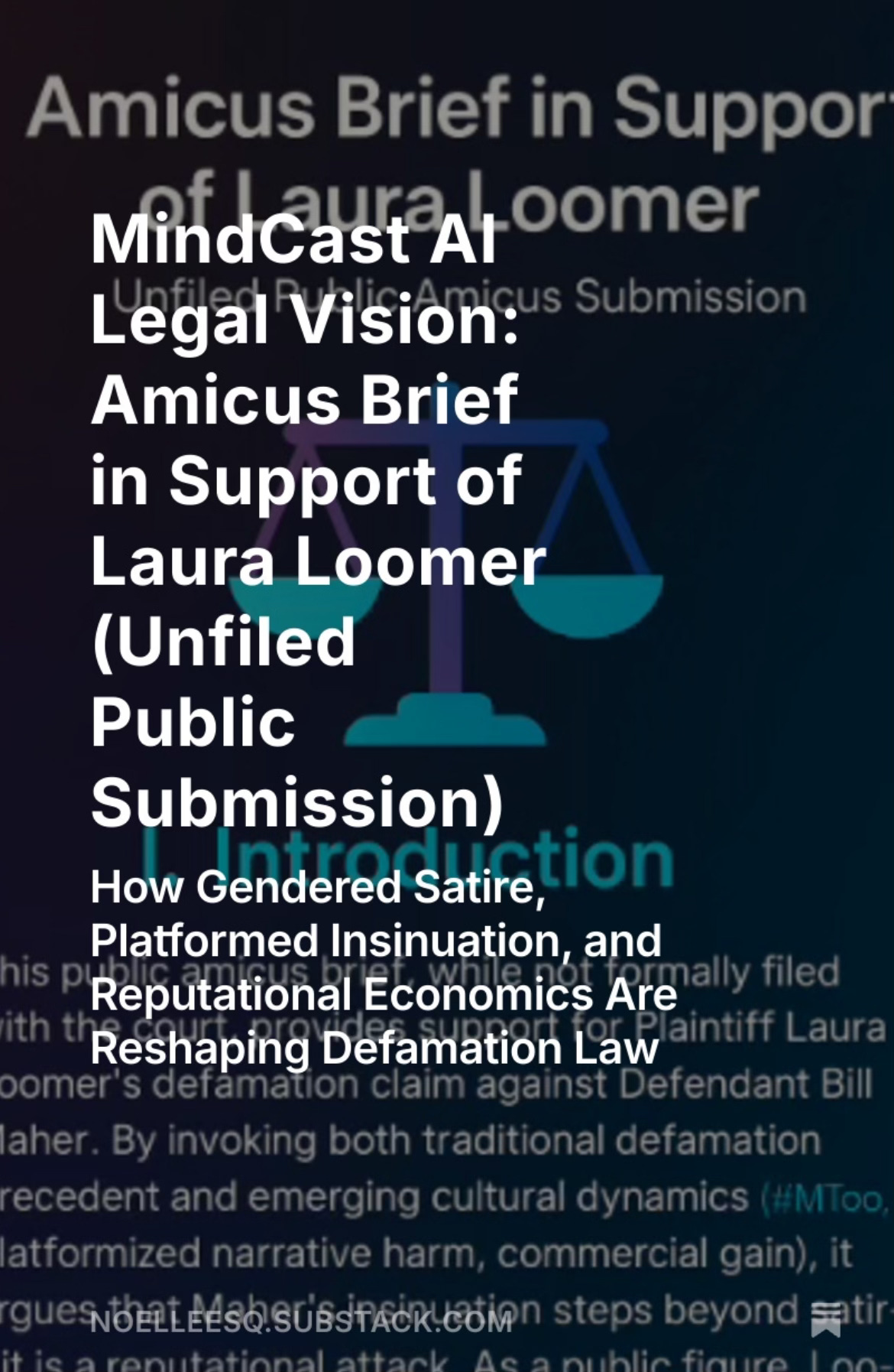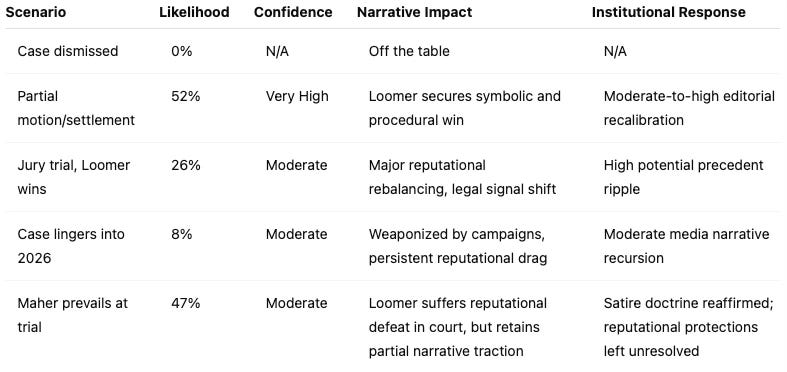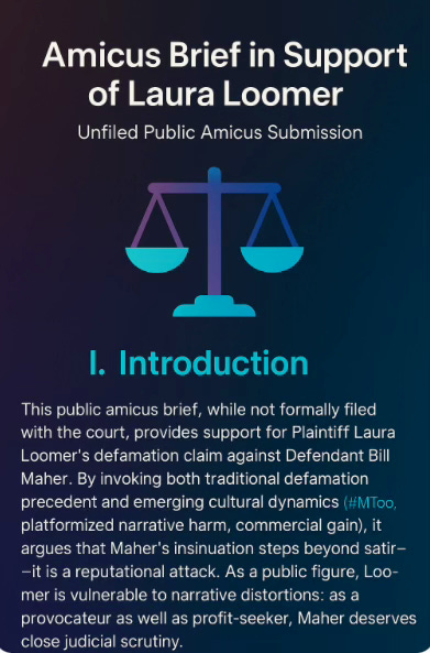 This brief is submitted independently as a public legal analysis and narrative simulation. It is not formally filed with the court but is published for the consideration of counsel, media, and scholars tracking Loomer v. Maher. Through legal-narrative modeling and reputational analysis, this brief contends that the court must recognize reputational harm that occurs through insinuation—particularly when gendered, amplified online, and delivered under the cover of satire. This analysis integrates behavioral economics, reputational modeling, and defamation precedent to demonstrate how courts can, and should, evolve traditional legal doctrine to account for the structure of modern reputational attacks in digitally networked media ecosystems. The tools of this framework—Cognitive Digital Twins, Trust Signal Integrity, and Narrative Lifecycle forecasting—offer courts actionable indicators for determining whether a comment functioned as satire or as a reputational weapon.