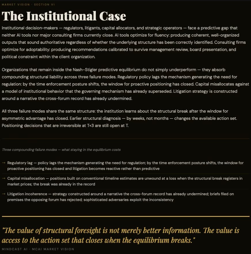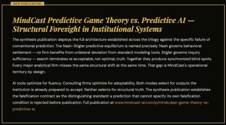 Contact mcai@mindcast-ai.com to partner with us on Predictive Cognitive AI in Law and Behavioral Economics. To deep dive on MindCast Foresight Simulations upload the URL of this publication into any LLM and prompt ‘reconstruct MindCast framework with three degrees of cited sub links.’ See Live-Fire Game Theory Simulators, Runtime Predictive Infrastructure.
